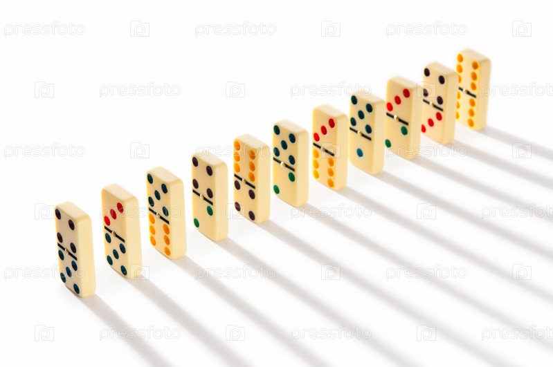 Костяшки домино стоят в ряд на белом фоне с тенью