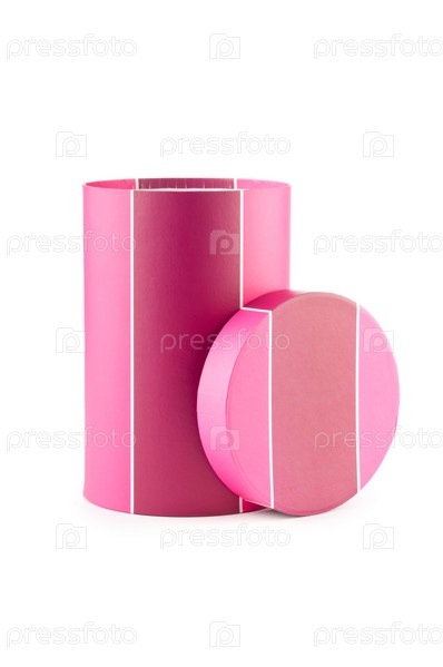 Открытая розовая коробка в форме цилиндра на белом фоне