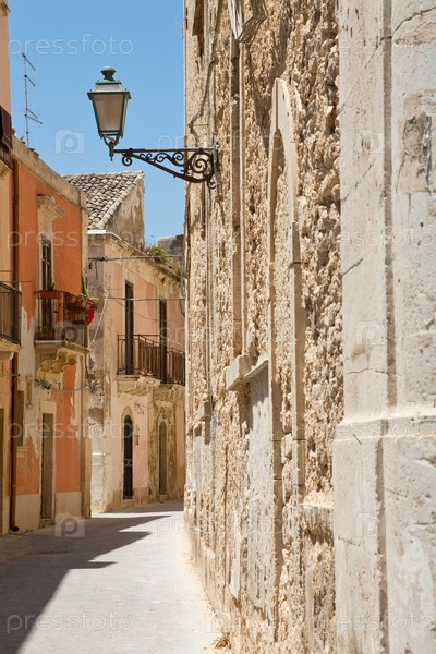 Узкая улица в стиле позднего барокко в Сиракузах. Сицилия, Италия