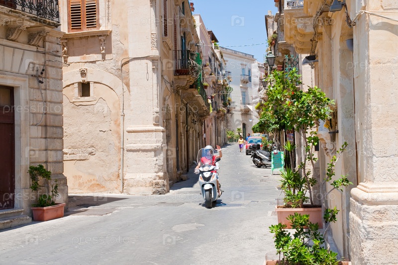 Узкая улица в стиле позднего барокко в Сиракузах. Сицилия, Италия
