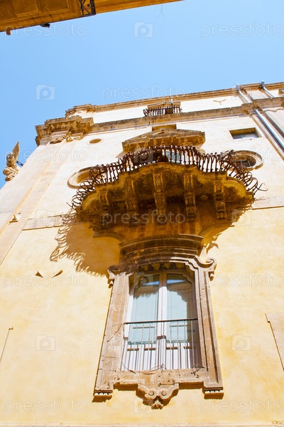 Старое окно и балкон дома в стиле барокко в городе Ното. Сицилия, Италия