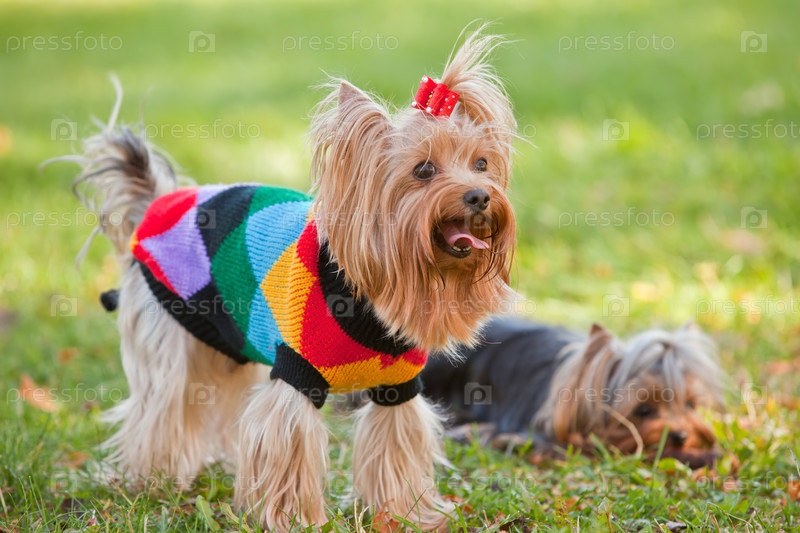 Два йоркширских терьера на траве в парке