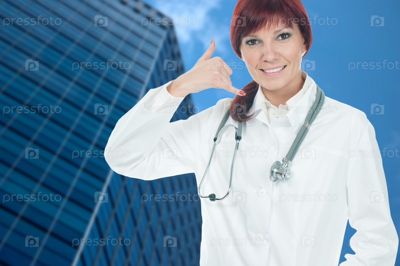 Успешная женщина-врач, показывающая жест "позвони мне"