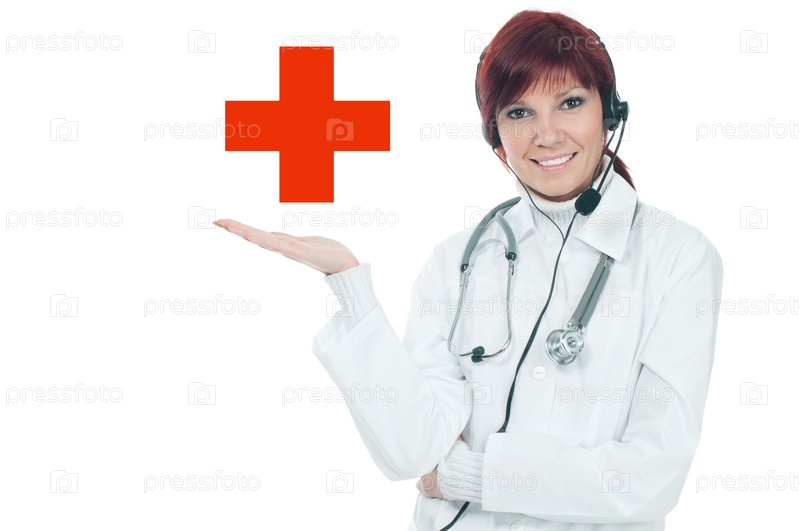 Приветливая улыбающаяся женщина-врач с гарнитурой на белом фоне