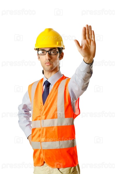 Молодой строитель в рабочей форме с вытянутой вперед рукой