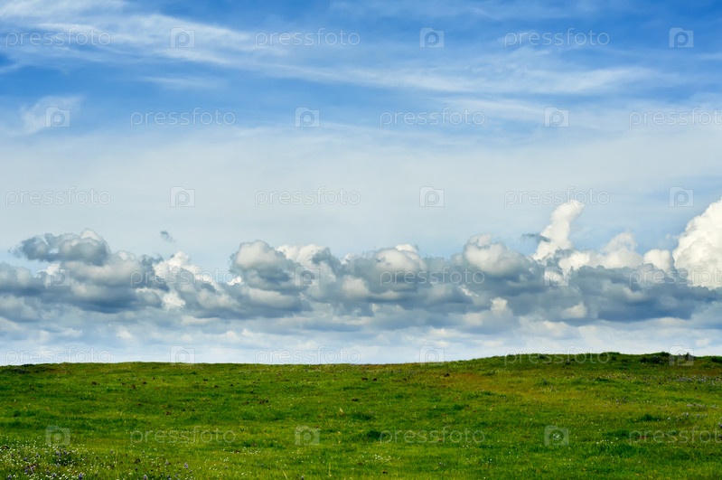 Зеленое поле и голубое небо с облаками