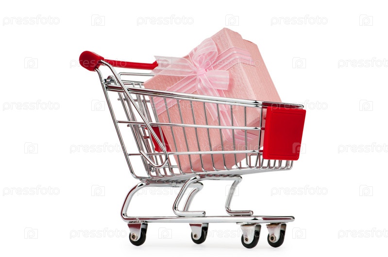 Подарок в розовой коробке в продуктовой тележке на белом фоне
