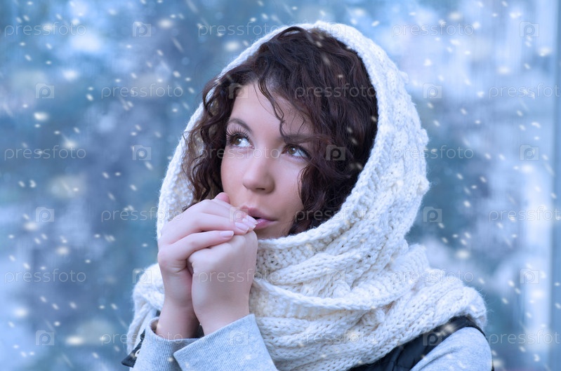 Портрет молодой женщины в белом платке с капюшоном