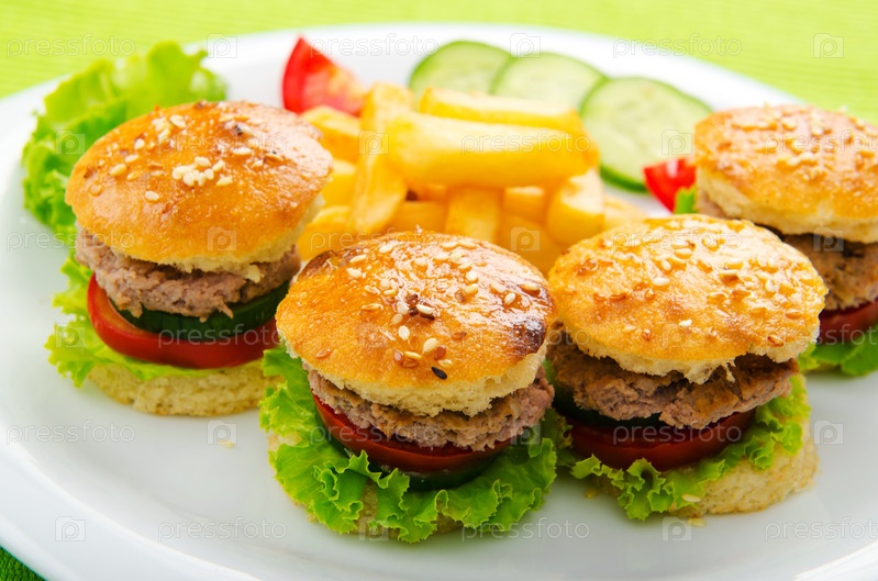Миниатюрные гамбургеры и картофель фри с овощами на тарелке