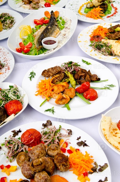 Жареное мясо с овощами в тарелках и блюдо с рыбой