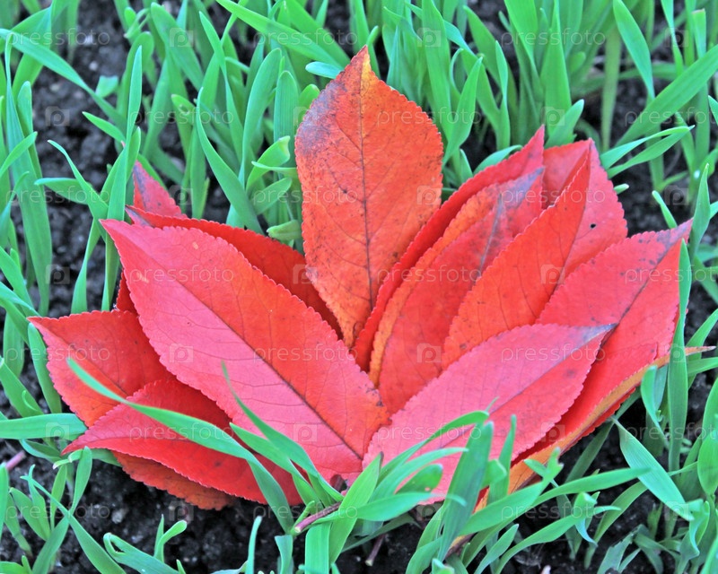 Веер из осенних листьев на зеленой траве