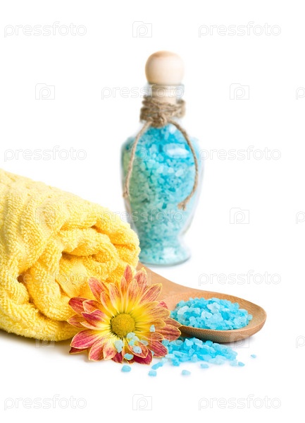 Полотенце, голубая соль для ванн и цветы на белом фоне