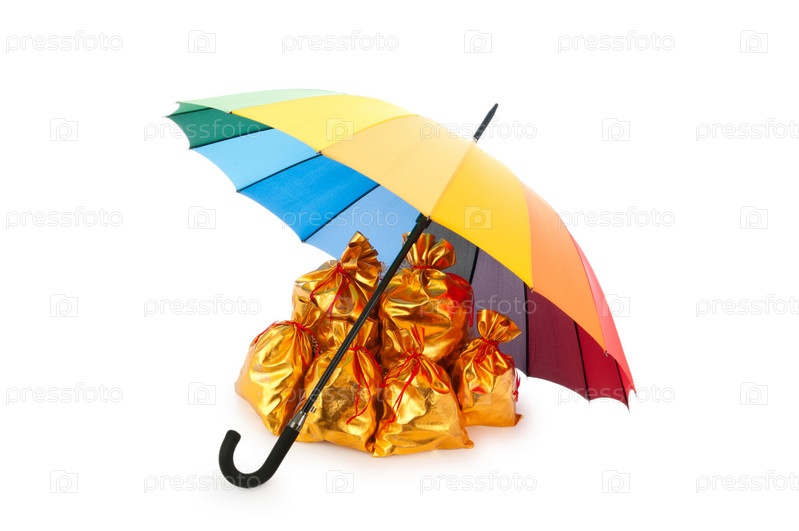 Золотистые мешки под зонтиком на белом фоне