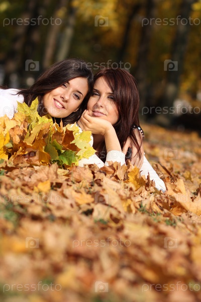 Две молодые привлекательные девушки в осеннем лесу