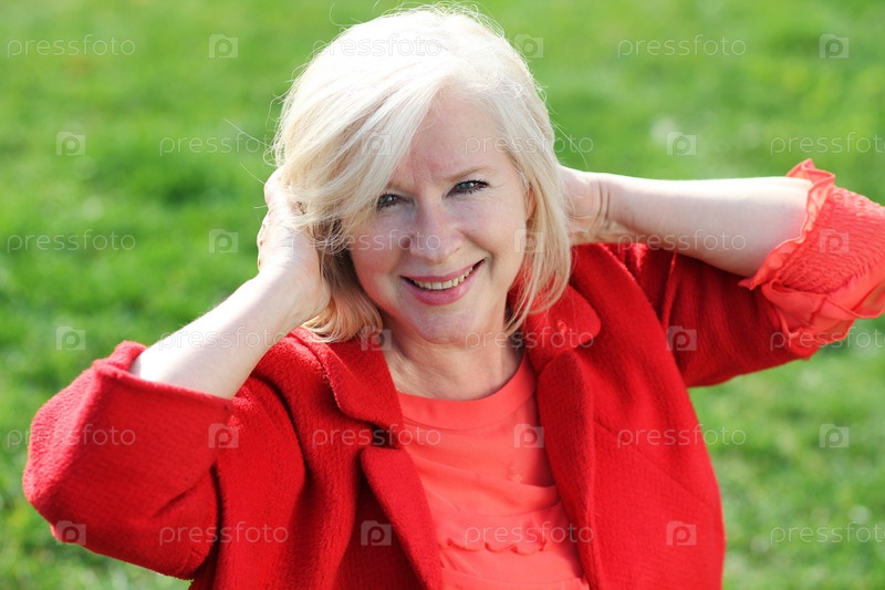 Портрет улыбающейся пожилой женщины на открытом воздухе