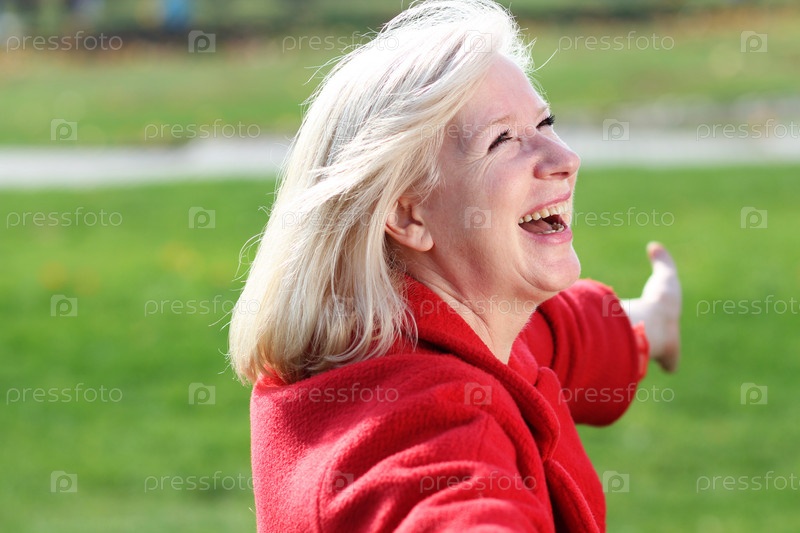Портрет улыбающейся пожилой женщины на открытом воздухе