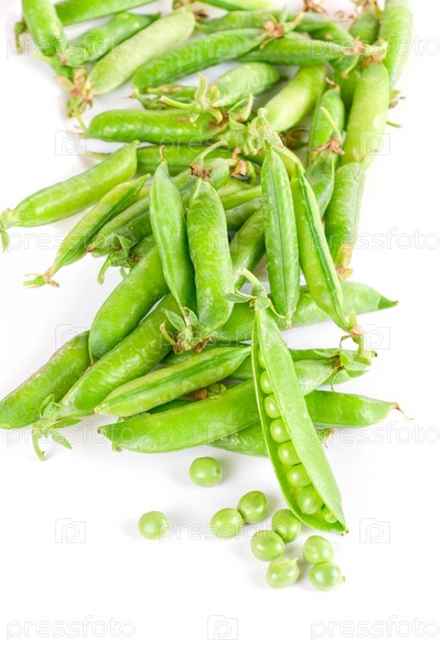 Спелые стручки зеленого гороха на белом фоне