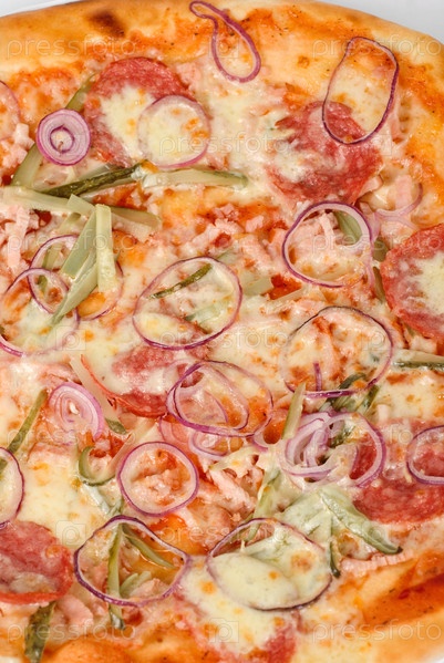 Пицца крупным планом с копченым мясом, колбасой, огурцами, луком и сыром моцарелла