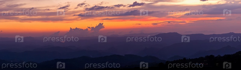 Панорама заката в горах. Муннар, Керала, Индия