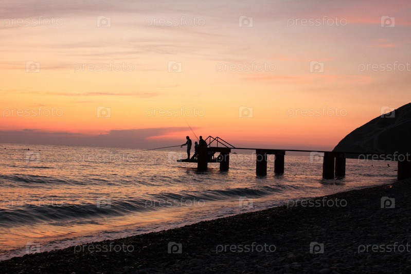 Силуэты рыбаков на фоне заката морского пейзажа
