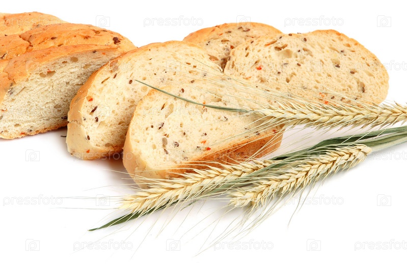 Нарезанный белый хлеб и колосья на белом фоне
