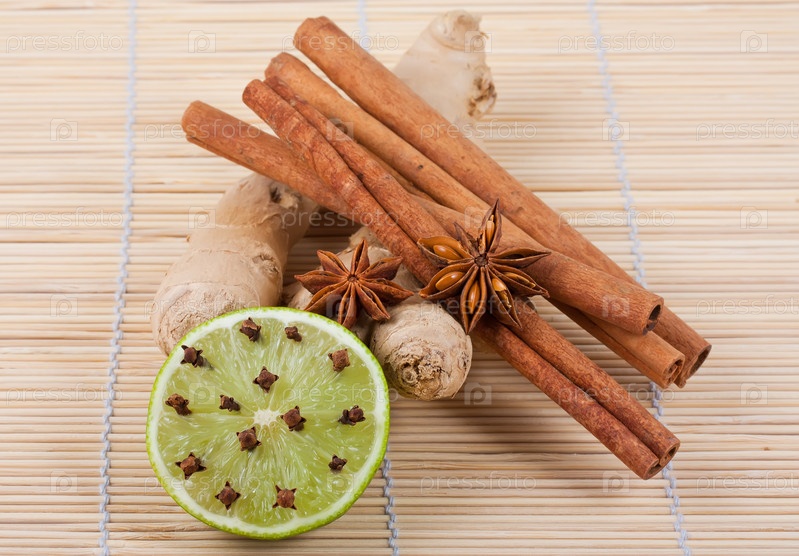 Корень имбиря, анис, корица, гвоздика на бамбуковой циновке