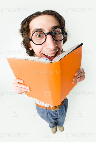 Портрет улыбающегося мужчины в очках, читающего интересную книгу