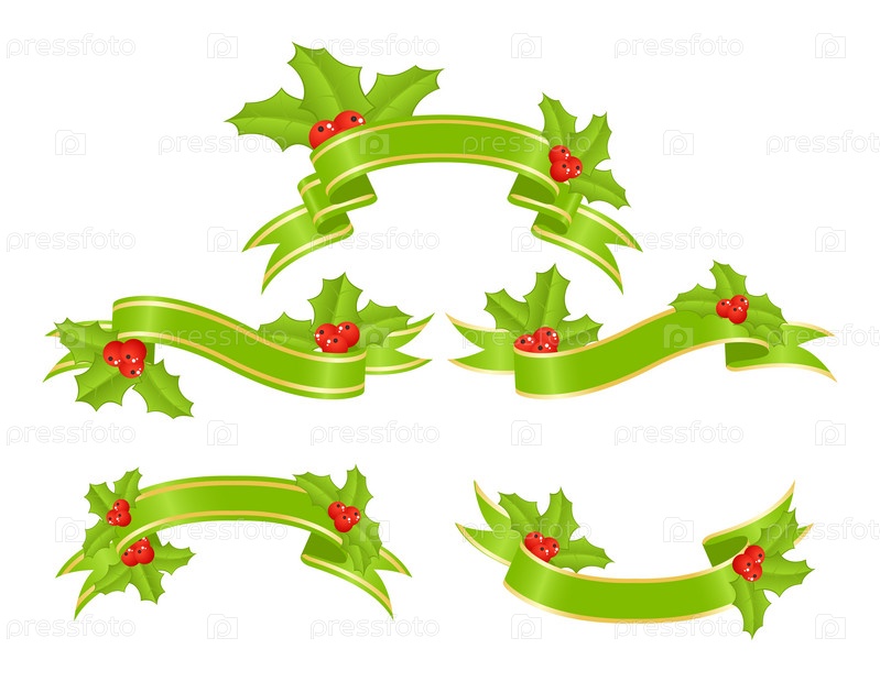 Зеленые ленты и остролист на белом фоне