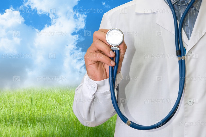 Мужчина-врач со стетофонендоскопом в руке на фоне зеленой травы и голубого неба