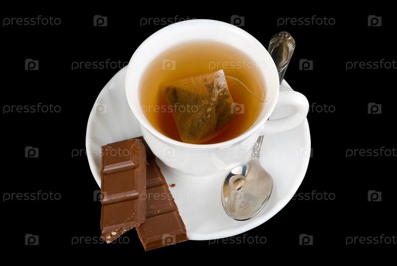 Чашка чая с шоколадом на черном фоне