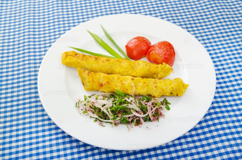 Традиционный азербайджанский шашлык из картофельного пюре с овощами на белой тарелке