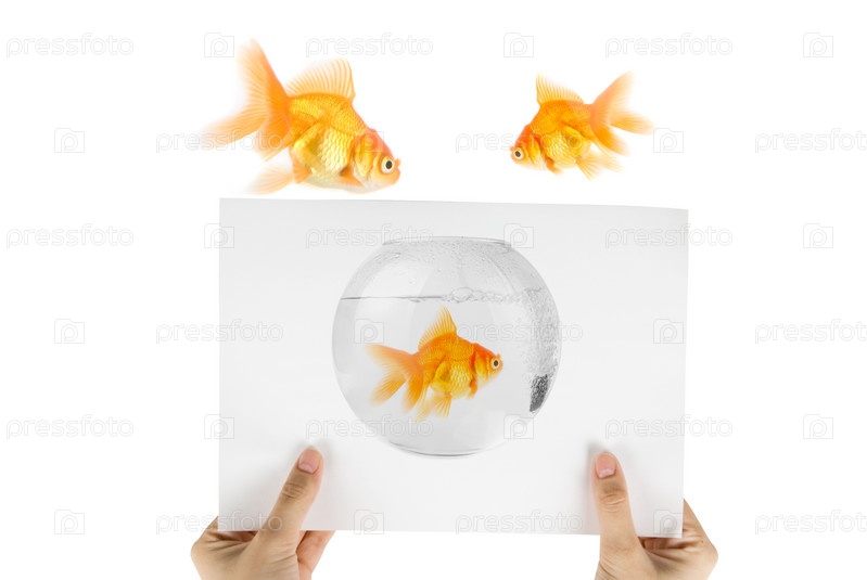 В руках фотография золотой рыбки в аквариуме на белом фоне