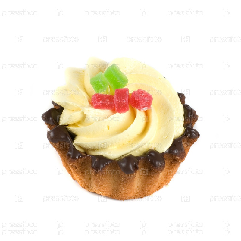 Кекс со сливками и мармеладом на белом фоне