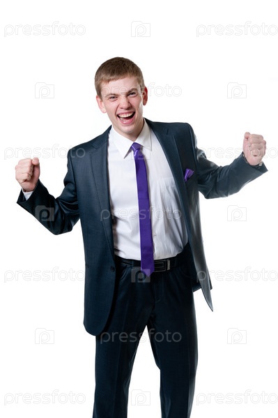 Эмоциональный мужчина в костюме на белом фоне