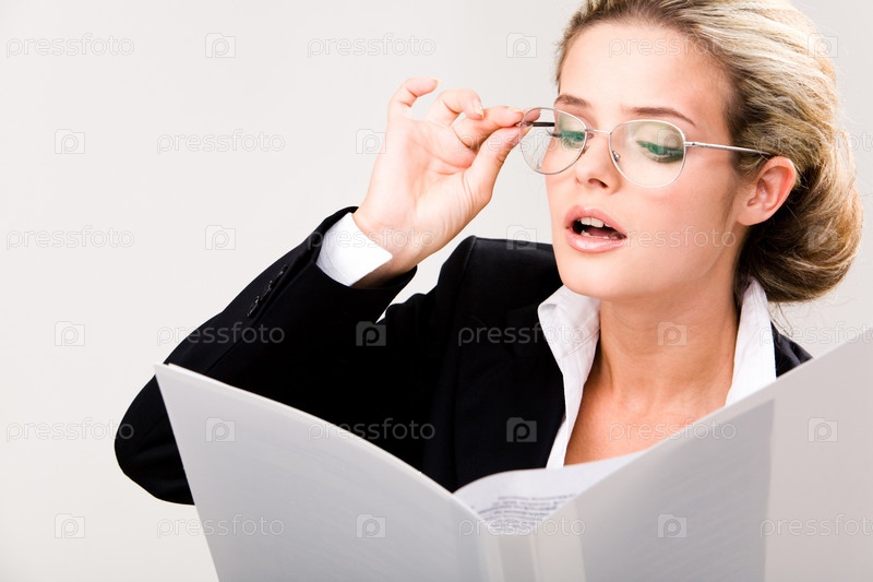 Портрет умной деловой женщины в очках, смотрящей на документ в руке и читающей его