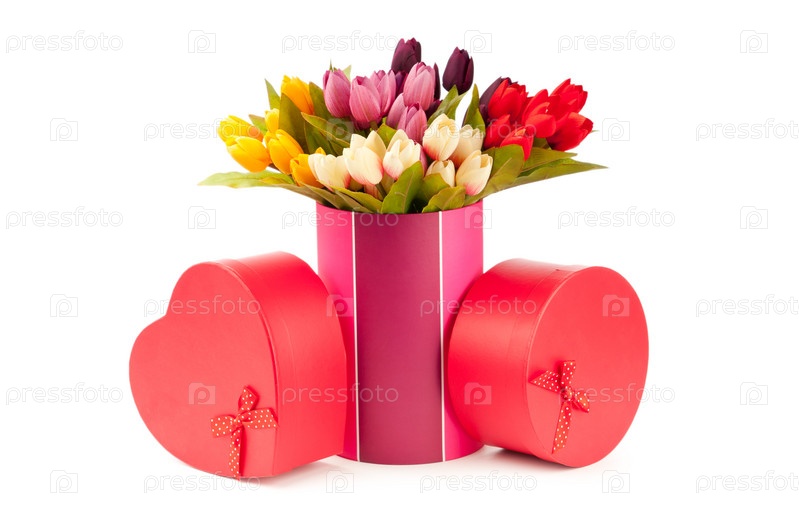 Две подарочные коробки и тюльпаны на белом фоне