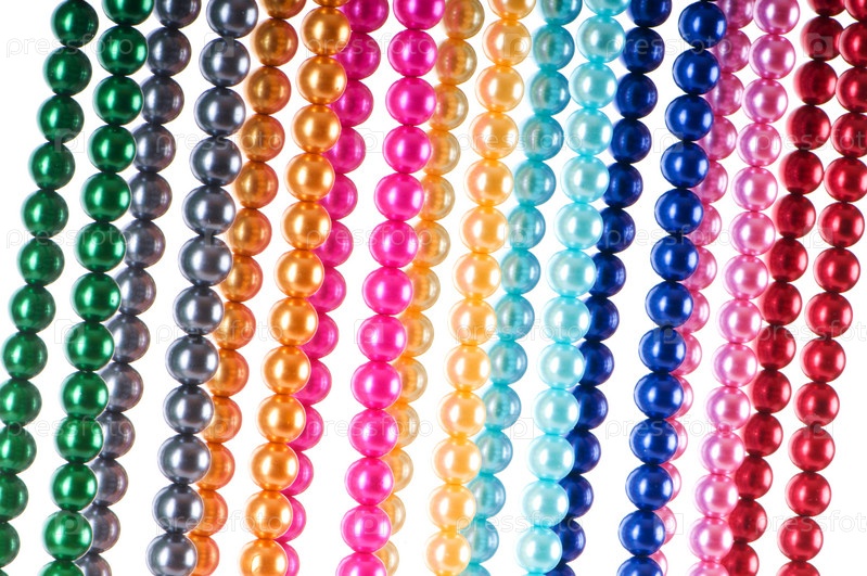 Нити из разноцветного жемчуга на белом фоне