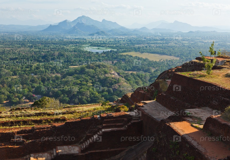 Вид горной долины и руин на вершине Сигирия. Шри Ланка