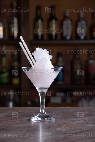 Напиток со льдом в стеклянном фужере на барной стойке