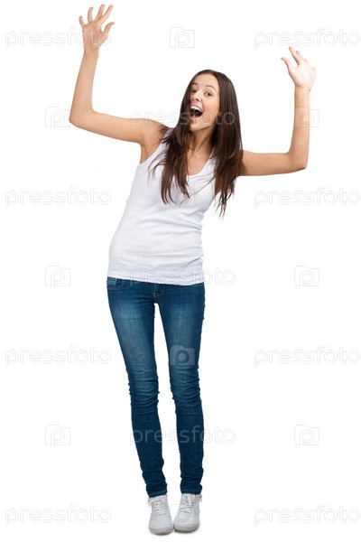 Взволнованная девушка в повседневной одежде с поднятыми вверх руками