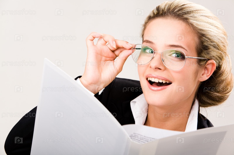 Портрет уверенной в себе женщины, которая носит очки и счастливо смотрит на камеру