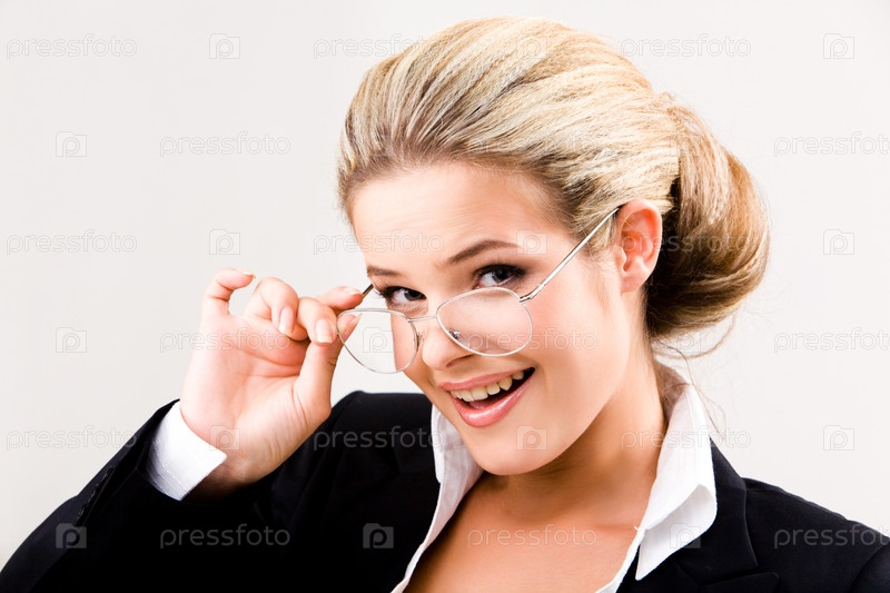 Фото улыбающейся деловой женщины с очками, изолированной на белом фоне