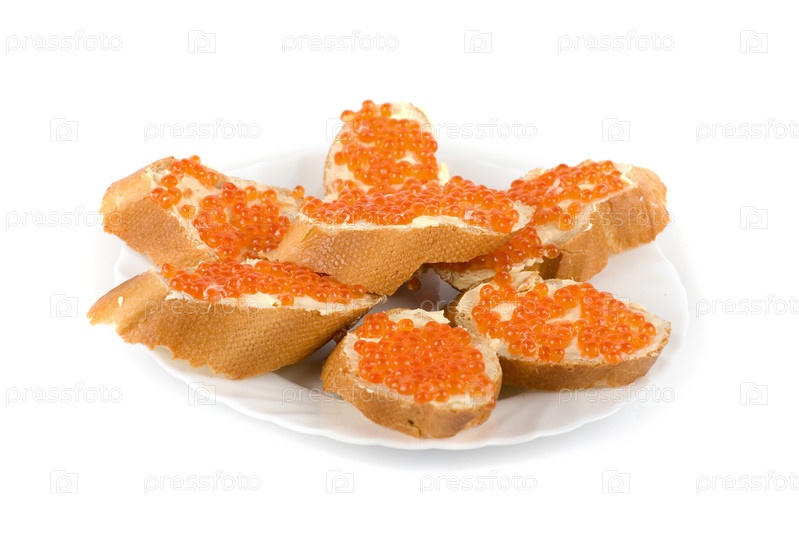 Бутерброды с красной икрой на тарелке, изолированы на белом фоне
