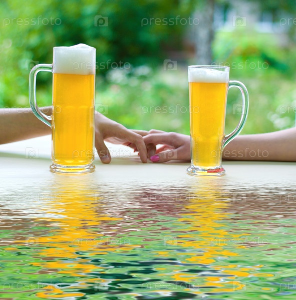 Влюбленная пара с бокалами пива на отдыхе у воды, крупный план
