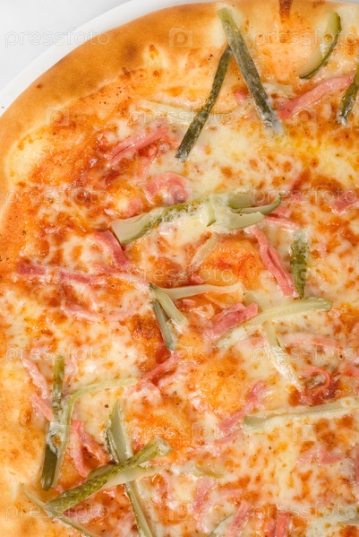 Пицца с вареной колбасой, ветчиной, маринованными огурцами и сыром моцарелла крупным планом
