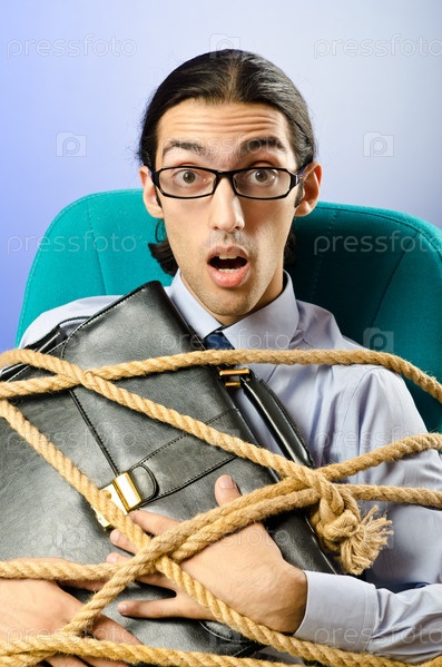 Бизнесмен, привязанный веревкой к рабочему месту