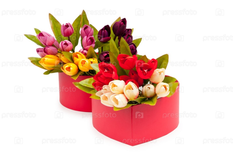 Букет разноцветных тюльпанов и подарочная коробка в форме сердца на белом фоне