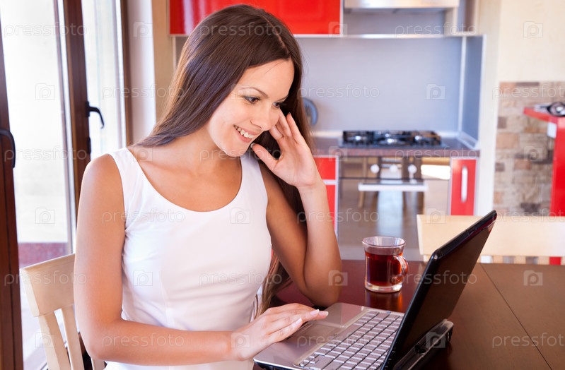 Молодая женщина с ноутбуком на кухне