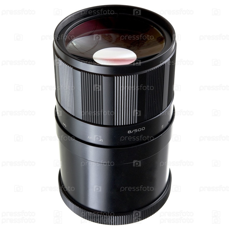 Старый зеркальный объектив 500 мм на белом фоне