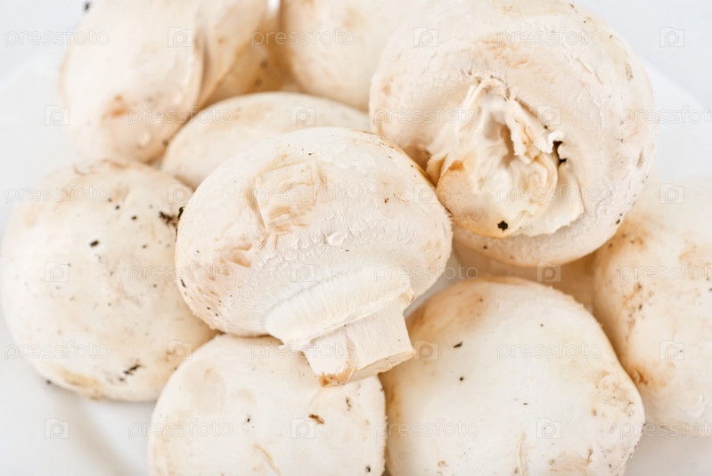 Сырые шампиньоны на тарелке, изолированы на белом фоне
